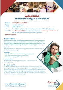 Op zaterdag 29 november 2025 organiseert Cultuurpunt Ronde Venen een gratis workshop “Subsidieaanvragen met ChatGPT” van 14:00 tot 16:00 uur in Sociaal Cultureel Centrum De Boei in Vinkeveen. De workshop wordt gegeven door Justin de Vries, ontwerper en adviseur in de culturele sector, die laat zien hoe je ChatGPT slim kunt inzetten om betere subsidieaanvragen te schrijven.
